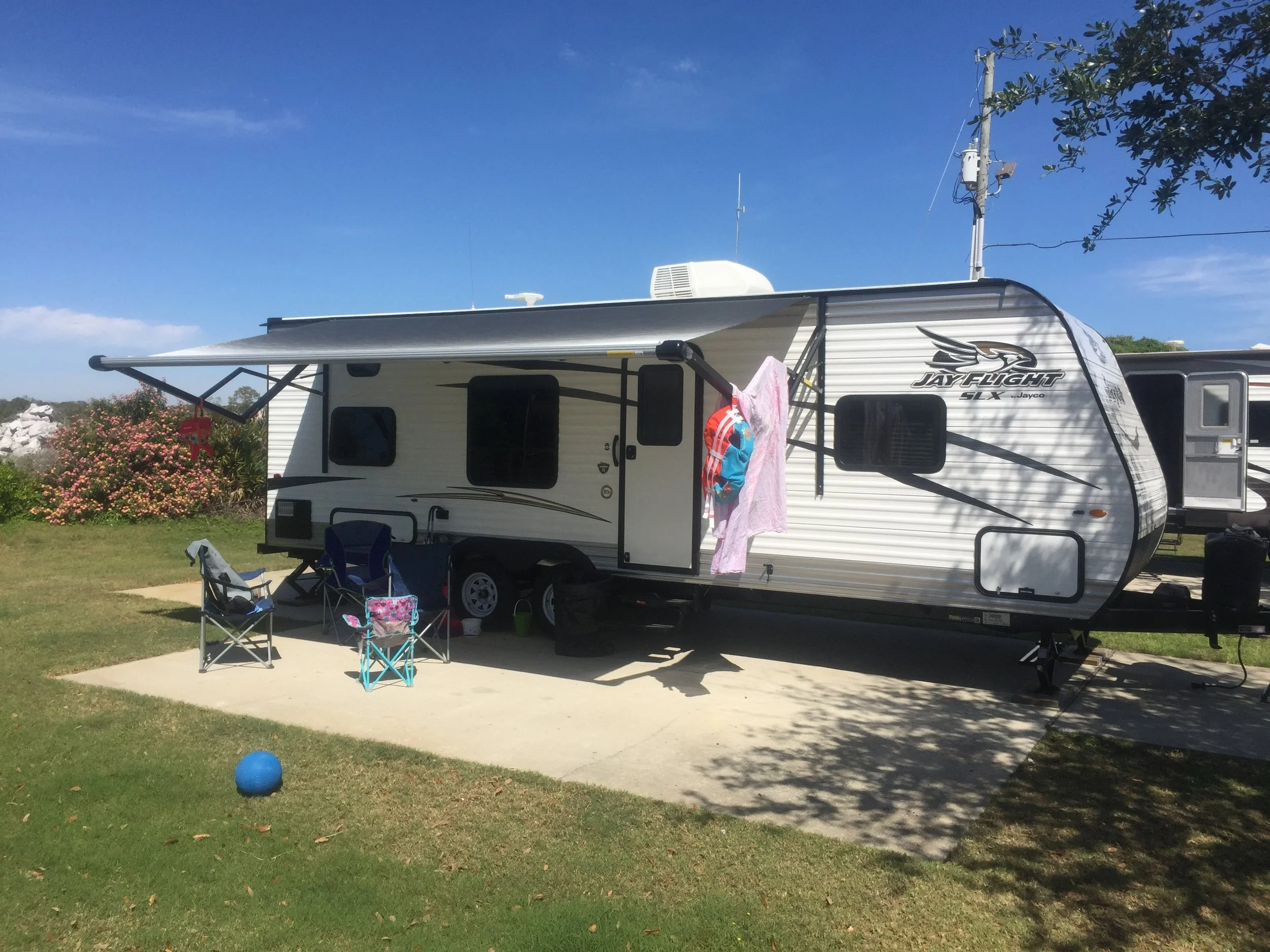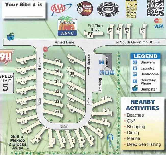 After arriving and checking in we were told that the first night we would be in a pull through and would unhook in the morning and move to our next site where we would stay put the remainder of our trip. They had another cancellation that allowed us to only unhook once. The staff there was very friendly and the grounds were kept immaculate. They helped us back in to the new spot and get situated. The RV resort itself is only 2 blocks from public access to the beach. We took the short walk with the girls everyday to the beach and found it to be extremely convenient. Not only will we stay here again, we are already planning our next trip down. Below you will find a link to the website, site map and directions.
